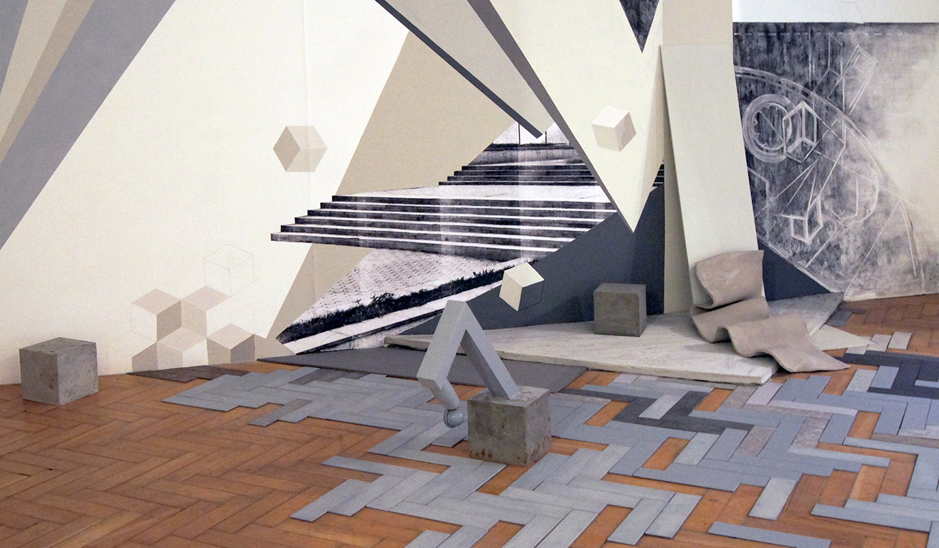 'Sketch for a Failure of Budgets'. 2015. Paint, charcoal, photocopies, pencil on wall, MDF, cement, clay, linoleum. 280 x 390 x 250cmSketch for a Failure of Budgets II is a site-specific drawing re-created for the Royal British Society of Sculptors, London. Like 'Sketch for a failure of budgets,' 2015, it explores the universal issue of budget failure from mass development schemes to small scale domestic projects, playing with the notion of influence that architecture and materials have on the individual, both emotionally and behaviourally. Once again operating within a self-enforced conceptual constraint of using materials that cost £3 or under, the work was created from readily available budget materials such as cement, MDF, linoleum flooring samples, photocopies, charcoal and clay alongside discounted mismatched paint samples; the installation examines plans and failure, whilst celebrating resourcefulness and ingenuity.